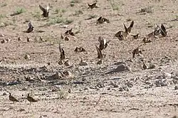 Sandgrouse are gregarious, feeding in flocks of up to 100 birds. As a consequence of their dry diet, they need to visit water sources regularly. Drinking times vary among the species. Ten species drink at dawn, four at dusk, and two at indeterminate times.[3] When drinking, water is sucked into the beak, which is then raised to let the water flow down into the crop. By repeating this procedure rapidly, enough water to last twenty four hours can be swallowed in a few seconds.[3] As they travel to water holes, they call to members of their own species and many hundreds or thousands synchronise their arrival at the drinking site despite converging from many different locations scattered over hundreds of square miles (kilometres) of territory.[8]