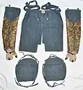 Traditional Japanese armour had six main components (hei-no-rokugu, roku gu, or roku gusoku), the dou or dō (chest armour), kabuto (helmet), mengu (facial armour), kote (armoured sleeves), sune-ate (shin armour), and the hai-date (thigh armour).[1][2][3] The sangu was composed of the suneate (shin armour), kote (armored sleeves), haidate (thigh armour). These armour components were a combination of a cloth backing and various types of armour that was attached to the cloth backing. On an original authentic suit of Japanese armour (gusoku) the cloth backings, edgings, decorations etc. and the armour elements would all be matching to each other.[4]