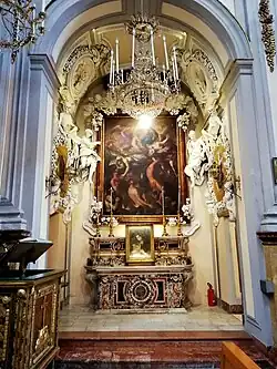 The church was open to the public in 1662.[1] The nave, and maybe the entire building, was designed by Giacomo Amato. In 1672, the church was refurbished with a rich decoration of stucco and painting.[1] The nave ceiling was frescoed with a depiction of the Glory of St Ursula by Gaspare Serenari. In the following century another refurbishment was made. The stucco decorations of Giacomo Serpotta for some of the chapels include multiple macabre skeletal representations.