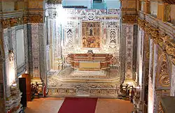 The altar was built by Giovanni Ragozzino based on a design by Solimena; it is flanked by an altarpiece by Luca Giordano. The dome was frescoed by Agostino Beltrano.