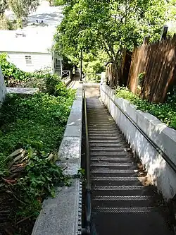 North of San Vicente Boulevard, which is the northernmost major street in Santa Monica, is an area that features some of Santa Monica's largest residential lots, that often have views of the Riviera Country Club, the Pacific Ocean or Santa Monica Canyon. One of the most picturesque streets in this neighborhood is La Mesa Drive, which is planted with a dense canopy of rare Moreton Bay fig trees, making the street a beautiful walking location. Farther west, and just a few blocks from the beach, lies Adelaide Drive with its historic homes and ocean views, where the Santa Monica Stairs can be found at 4th Street, which are a popular set of 189 very steep steps that lead down into the canyon. In addition to being used as a convenient direct route from Adelaide Drive to Santa Monica Canyon, the steps are often used for intense workouts and are an excellent place for spotting sweating celebrities. Streets north of San Vicente are usually short and contain gated estates. North of San Vicente the streets are La Mesa Drive, La Mesa Way, Gale Place (developed by one of the area's prolific post-Depression contractors, Cecil Gale), Woodacres Road, Esparta Way, Ermont Place, Foxtail Drive, Larkin Place, Winnett Place and Adelaide Drive. This is part of the "North of Montana" 90402 zip code.