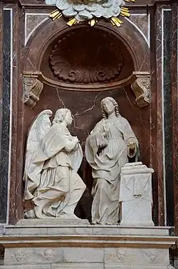 On the high altar there was a white marble sculpture entitled “The Annunciation” representing the kneeling Virgin with the Archangel Gabriel next to her and the Holy Father above them. This work was realized in 1545 by Antonino Gagini and Giacomo Gagini.[5] In 1906 it was placed in Saint Olivia's Church,[5] while the statue of Madonna of Carmelo, realized in paper pulp and carried in procession by the friars, is hosted inside Saints Paul and Bartholomew's Church.
