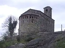 The 11th-century building has the characteristic features of the Romanesque churches in the area, such as the belltower in the center of the façade.