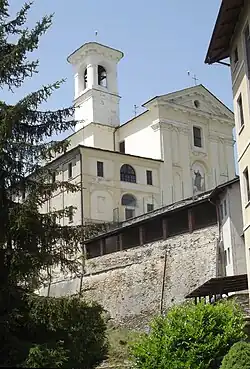 In 1676, the land for the sanctuary was acquired and a centralized sanctuary was built under the rule of the Jesuits. The Jesuit order was temporarily suppressed in 1773, and in 1789, the sanctuary became property of the Archbishop of Turin. A Franciscan order became attached to the property. In the first decades of the 19th century, the church was refurbished to its present Neoclassical design.[1] Inside the church are two rock piles, one is the virtual peak of the mountain and the main altar, and the second hold statue of St Ignatius. Bernardo Vittone helped design the altar.[2]