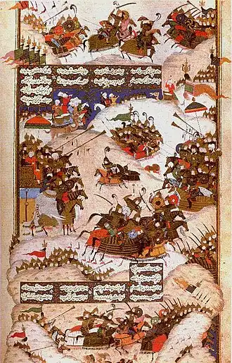 ![]() Medieval Iranian art illustrating Khosrow II and Bahram Chobin in a battle | ||||||||||