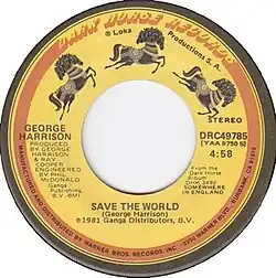 "Save the World" is a song by English rock musician George Harrison, released as the final track of his 1981 album Somewhere in England. It was also the B-side of "Teardrops", which was the second single off the album. An environmental protest song, "Save the World" was Harrison's first composition to directly address topical issues such as the nuclear arms race, rainforest and wildlife devastation and the ecologically irresponsible practices of corporate concerns. Musically, the song partly recalls the style of the comedy troupe Monty Python.