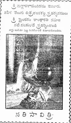 Sati Savitri is a 1933 Indian Telugu language mythological film directed by C. Pullayya. Based on a popular stage play by Mylavaram Bala Bharathi Samajam, the film was a cinematic adaptation of the Mahabharata's Aranya Parva, focusing on the legendary story of Savitri and Satyavan. It starred stage actors Vemuri Gaggayya as Yama and Dasari Ramathilakam as Savitri.[1]