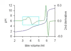 - Location of an end-point in a titration curve. An end-point is an inflection point where the second derivative of the function is zero.[9] The titration curve for malonic acid illustrates the power of the method. The first end-point at 4 ml is barely visible, but the second derivative allows its value to be easily determined by linear interpolation to find the zero crossing.