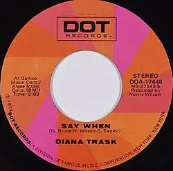 Australian native Diana Trask went to the United States in 1959 looking to expand her career. She first found opportunities as a pop singer and recorded two albums with Columbia Records. After a brief stint in Australia, she reinvented herself as a country artist after being drawn to the genre. Her first country singles were released in the late 1960s but found little success until she had a series of top 20 singles in the 1970s, beginning with "Say When".[3] The song's story line was centered on a woman who is in love with a man and is ready for him to have the similar feelings for her.[2] The song was co-written by Dottie Bruce, Carmol Taylor and Norris Wilson. Wilson also produced the single.[4] "Say When" would be among a series of singles Trask recorded with Wilson that she found commercial success with.[5]