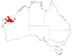A holotype of the species, PERTH 01149342, was collected by J.V. Blockley on 30 May 1966 at Bee Gorge, near Wittenoom.[6]
