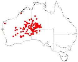 In the Northern Territory, it is found in the IBRA bioregions of Burt Plain, Central Ranges, Finke, Gibson Desert, Great Sandy Desert, Great Victoria Desert, MacDonnell Ranges, and Tanami.[3] In South Australia it occurs in the northwest of the state (no IBRA regions given).[6]