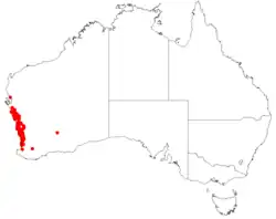 It grows in the IBRA regions: Avon Wheatbelt, Geraldton Sandplains, Jarrah Forest, Swan Coastal Plain, and Yalgoo.
