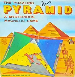 Puzzling Pyramid (1960) is a game for 2, 3 or 4 players of all ages. The object of the game is for each player to use a magnetic exploring wand to guide a steel ball up one of the four colored (yellow, red, green, blue) sides of a pyramid into a common treasure vault at the top. On the inside of each side of the pyramid, plastic tunnel blocks are placed by an opposing player before the start of the game, which are designed to impede the wand user's progress to the top, however at least one open path must be provided.[19][20]
