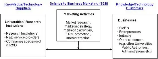 Science-to-Business (S2B) Marketing aims at the use of marketing principles for the area of science, supporting the successful commercialisation of research competencies, capacities and results from a research institution to its research customers.[1] The objective thereby is to develop, test and provide new models, instruments and proceedings for research commercialisation that enable universities and research institutions to market their research more effectively. The approach uses existing instruments from Business to Business Marketing, Service Marketing and Technology & Innovation Marketing.