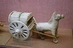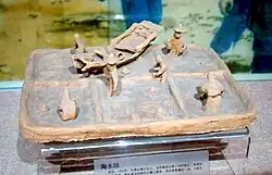 Modern archaeology has led to the discovery of Han artwork portraying inventions which were otherwise absent in Han literary sources. This includes the crank handle. Han pottery tomb models of farmyards and gristmills possess the first known depictions of crank handles, which were used to operate the fans of winnowing machines.[59] The machine was used to separate chaff from grain, but the Chinese of later dynasties also employed the crank handle for silk-reeling, hemp-spinning, flour-sifting, and drawing water from a well using the windlass.[59] To measure distance traveled, the Han-era Chinese also created the odometer cart. This invention is depicted in Han artwork by the 2nd century CE, yet detailed written descriptions were not offered until the 3rd century.[60] The wheels of this device rotated a set of gears which in turn forced mechanical figures to bang gongs and drums that alerted the travelers of the distance traveled (measured in li).[61] From existing specimens found at archaeological sites, it is known that Han-era craftsmen made use of the sliding metal caliper to make minute measurements. Although Han-era calipers bear incised inscriptions of the exact day of the year they were manufactured, they are not mentioned in any Han literary sources.[62]