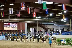 As of 2015, the show consisted of competition in multiple divisions: Mounted Native Costume; Breeding/Halter; Dressage; Driving; working western (Reining, cutting, Working cow horse), English Pleasure (including show hack, park horse, and country English pleasure); Hunter/Jumper and hunter under saddle; Liberty (featuring a horse running free with accompanying music); and Western Pleasure as well as a youth division for most classes.[9][6] The top prize of the show is "Scottsdale Supreme Halter Champion".[10] This prize is given both to a mare and a stallion champion.[11] Crowds at the event have exceeded 200,000.[6] In 2015, over 320,000 visitors attended the 11 days of the event, with an additional 450,000 viewers around the world over a live television feed.[12] A unique feature of the show is the user-friendly instructions which allow spectators to better understand the scoring system of the judges.[6]