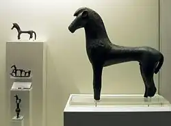 In the foreground, at right, the sculpture of a horse; in the background, various small archaic sculptures