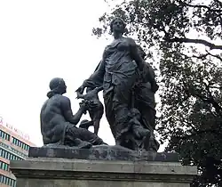 Finally, 28 works were installed: Maternity, by Vicenç Navarro; Young, by Josep Dunyach; The forger, by Josep Llimona; Woman with child and piccolo, by Josep Viladomat; Female Figure, by Enric Casanovas; Youth, by Josep Clarà; Flute Shepherd, by Pablo Gargallo; Navigation, by Eusebi Arnau; Barcelona, by Frederic Marès; Montserrat, by Eusebi Arnau; Female Figure, by Josep Llimona; Hercules, by Antonio Parera; Woman with Angel, by Vicenç Navarro; Tarragona, by Jaume Otero; Fuente de los seis putti, by Jaume Otero; Lérida, by Joan Borrell; Mujer con imagen de la Virgen, by Enric Monjo; El espíritu popular, by Jaume Otero; Pastor del águila, by Pablo Gargallo; Pomona, by Enric Monjo; Wisdom, by Miquel Oslé; The Goddess, by Josep Clarà; Work, by Llucià Oslé; Emporion, by Frederic Marès; Fisherman, by Josep Tenas; Woman, by Joan Borrell; Montseny, by Jaume Duran; and Gerona, by Antonio Parera.[10] Originally there was also in the square the group Niños cabalgando sobre peces (1928), by Frederic Marès, a fountain with water jets and four of the figures indicated in the title, which was moved in 1961 to the intersection of Gran Vía and Rambla de Cataluña.[11]