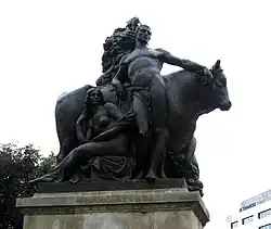 | Gerona | Antonio Parera | Bronze | 2,92 x 1,72 x 3,85 | This group on pedestal is facing the university round, closing the sculptural cycle of the square. It is an allegory of Gerona, the fourth of the Catalan provinces represented in the square. In this case it is symbolized in an agricultural allegory, represented by an ox with two women on one side, one seated and the other standing holding a basket with agricultural products; and a man and a woman on the other side, the female figure seated and the male standing. All the figures are naked, which emphasizes the classicism of the scene. Foundry: Gabriel Bechini (Barcelona).[46] |