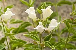 It is a small plant growing up to half a meter high, bearing small, white or yellowish snapdragon-like flowers which are said to smell of apples. The leaves are green and arranged oppositely on the erect stem.