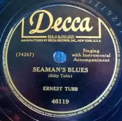 "Seaman's Blues" is a country music song written by Billy Tubb, performed by Ernest Tubb, and released on the Decca label (catalog no. 46119). In May 1948, it reached No. 5 on the Billboard folk best seller chart.[1] Furthermore, it secured the position of No. 16 on Billboard's year-end folk record seller's chart for 1948.[2]