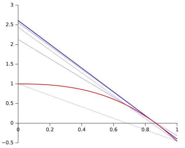 The first two iterations of the secant method. The red curve shows the function f, and the blue lines are the secants. For this particular case, the secant method will not converge to the visible root.