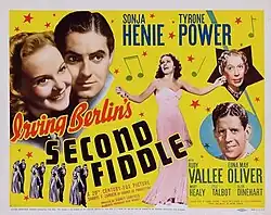 Second Fiddle is a 1939 American musical romance film directed by Sidney Lanfield, starring Sonja Henie, Tyrone Power, Rudy Vallée and Lyle Talbot and released by 20th Century Fox. The score was composed by Irving Berlin.[1] The screenplay, based on George Bradshaw's story Heart Interest, involves a Hollywood publicity agent who falls in love with a new actress he helped to discover. The film combines a parody of the extensive search for an actress to play Scarlett O'Hara in Gone with the Wind with a Cyrano de Bergerac–type plot.[2] It is sometimes known as Irving Berlin's Second Fiddle.