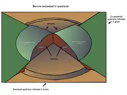 Sometimes called digging by quadrant this special case is a procedure for excavating circular features, usually mounds and barrows. Deposits are excavated from four quarters of the feature, starting with two diagonally opposite quadrants and perhaps ending with the other two. The quadrants are slightly offset, so that the outer balk of one is continuous (in reverse) with the outer face of its opposite, going through the center of the feature. After the recording of the sections, the balks may be removed and the rest of the feature excavated. The advantage of quarter sectioning is it allows a look at two complete cross-sections while still allowing excavation in plan thus allowing a better interpretation of the stratigraphy of the site. The merits of this sectioning and balk creation are disputed.