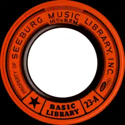 A Seeburg Background Music record is a vinyl record of a non-standard 9 inch (23 cm)-diameter size with a 2-inch (5 cm) center hole. The recording is monaural, with a playing speed of 16+2⁄3 rpm and a density of 420 grooves per inch.[2] A 0.5 mil diamond stylus is used for reproduction. Each side contains approximately 40 minutes of music (typically 20 songs). Records in each series were numbered 1-25 from 1959 to the July 1st 1966 set, and 101-128 from the October 1st 1966 set all the way to the last set. These numbers meant nothing other than an indication as to where a record belonged in the stack order.