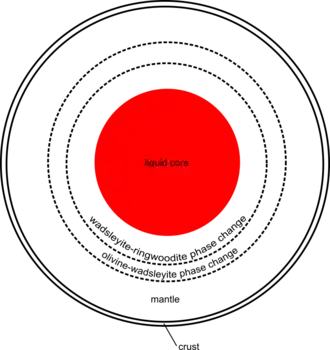 - 660 km discontinuity: a phase transition where of ringwoodite to bridgmanite and ferropericlase.[35]