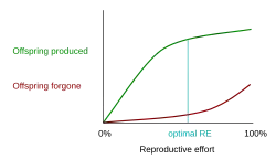 One class of models that tries to explain the differential evolution of semelparity and iteroparity examines the shape of the trade-off between offspring produced and offspring forgone. In economic terms, offspring produced is equivalent to a benefit function, while offspring forgone is comparable to a cost function. The reproductive effort of an organism—the proportion of energy that it puts into reproducing, as opposed to growth or survivorship—occurs at the point where the distance between offspring produced and offspring forgone is the greatest.[13]