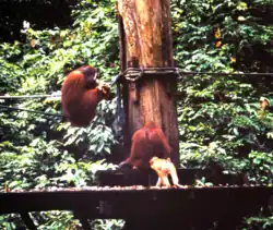 The centre opened in 1964 as the first official orangutan rehabilitation project for rescued orphaned baby orangutans from logging sites, plantations, illegal hunting or kept as pets.[1] The orphaned orangutans are trained to survive again in the wild and are released as soon as they are ready. The sanctuary is located within the Kabili-Sepilok Forest Reserve which covers an area of 4,294 ha (10,610 acres), much of which is virgin rainforest.[2] The reserve has been designated an Important Bird Area by BirdLife International. Today around 60 to 80 orangutans are living free in the reserve.[3]