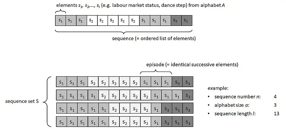 A sequence s is an ordered list of elements (s1,s2,...,sl) taken from a finite alphabet A. For a set S of sequences, three sizes matter: the number n of sequences, the size a = |A| of the alphabet, and the length l of the sequences (that could be different for each sequence). In social sciences, n is generally something between a few hundreds and a few thousands, the alphabet size remains limited (most often less than 20), while sequence length rarely exceeds 100.