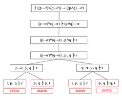 This process can always be continued until there are only atomic formulas in each side. The process can be graphically described by a rooted tree, as depicted on the right. The root of the tree is the formula we wish to prove; the leaves consist of atomic formulas only. The tree is known as a reduction tree.[22][24]