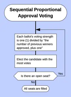 Sequential proportional approval voting uses approval voting ballots to elect multiple winners on a round-by-round basis. With approval voting ballots, each voter may support any number of candidates on their ballot as they see fit. For tabulation, each ballot is weighted according to a formula, the candidate with the most support is elected, and the process is repeated until there are no more seats to fill.[5][6]