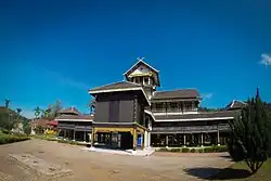 The Istana Lama (Negeri Sembilan Malay: Istano Lamo, Jawi: ايستان لاما) is regarded as the icon of Seri Menanti and one of the famous landmarks in Kuala Pilah District. It is the largest palace in Malaysia that is built entirely out of timber. It is made in part of chengal wood (Neobalanocarpus) and iron wood or belian wood (Eusideroxylon zwageri) and held together using only wooden pegs. The palace took six years to build and was completed in 1908 at a cost of $45,000.00 at that time. The design has subtle hints of Minangkabau architecture, has five levels rising to a height of sixty seven feet or approximately twenty meters high and has ninety nine columns to support the main structure. Four of the main columns of sixty seven feet are the Chengal timber that came from Bukit Pergai, Jelebu and is the central feature of the structure which holds up the apex of the palace, namely the Treasury Room. The Istana Lama was a replacement for Istana Pulih which was burned down by British soldiers. The drawings and plans for Istana Lama was detailed by Mr. Woodford (Public Works Department) based on the designs provided by two local craftsmen, Kahar and Taib. This palace was used until 1932 after which the Yang Di-Pertuan Besar moved to Istana Besar.