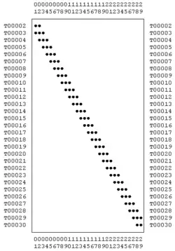 The data presented in this example was simulated by WinBasp. Initially 60 contexts (called units in WinBasp) were created along with 50 types. The contexts were labeled in chronological order by numbers 01 to 60, the types are labeled in the form T00001 to T00050. If a type is represented by one object only this object is not relevant for the chronological sequence as it does not provide a link to another context. Similarly, contexts containing one object only are irrelevant for seriation. Therefore, the contexts with one or no object and types represented by one object or not at all were eliminated. The resulting raw simulated data consisting of 43 contexts and 34 types are shown on the left. As expected, the dots indicating the occurrence of a type in a context are close to the diagonal of the table.
