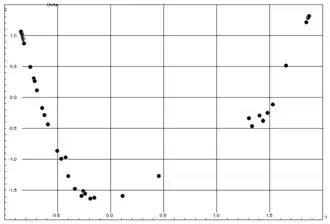 Note that the distances of the scores for adjacent contexts on the first axis vary: At the beginning and the end, the distances are extremely small, the largest distances in the centre is about 30 times as large as the smallest distance. Hill and Gauch (1979)[8] created a similar contingency table with a regular structure with each context containing six types. They note, too, that the within-context distances are smaller at the ends than in the middle. This was one of the reasons why they proposed an adjustment which is called detrended correspondence analysis.
