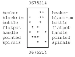 The raw data are stored in an unsorted binary contingency table indicating which design style can be found in which context by a star symbol. For example, consider the first column: context 3 contains the design styles blackrim, bottle, and handle. A beaker is contained in contexts 1 and 2. Contextual seriation sorts the design styles and the contexts in such a way that the star symbols are found as close as possible to the diagonal of the table. Of course, for a small examples like this, no computer programs are needed to find the best ordering, but for larger data sets like the 900 graves studied by Petrie they are extremely helpful.