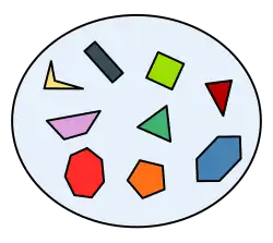 In mathematics, a set is a collection of different things.[2][3][4][5] These things are called elements or members of the set and are typically mathematical objects of any kind such as numbers, symbols, points in space, lines, other geometrical shapes, variables, functions, or even other sets.[6][7] A set may also be called a collection or family, especially when its elements are themselves sets; this may avoid the confusion between the set and its members, and may make reading easier. A set may be specified either by listing its elements or by a property that characterizes its elements, such as for the set of the prime numbers or the set of all students in a given class.[8][9][10]
