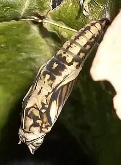 After shedding its skin, the pupa hardens and remains in a fairly rigid position. However the pupa can twist from side to side when disturbed. The pupae are variable in colour; being green, or creamy brown with small dark markings, or brownish and dark patterned. The pupa takes about ten days to mature and hatch into a butterfly.