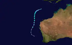 On 4 January, a tropical low developed within a monsoon trough over the Timor Sea.[12] Over the following several days, the system gradually tracked westward and intensified, being classified Tropical Cyclone Narelle on 8 January.[13] Turning southward into a region of low wind shear,[14] Narelle intensified into a severe tropical cyclone on 9 January.[13] Over the following two days, the cyclone's structure fluctuated, temporarily featuring an eye, before it maintained its organization and intensified further on 11 January.[15] The storm attained its peak intensity later on 11 January as a Category 4 cyclone with winds of 195 km/h (120 mph).[16] Around the same time, the JTWC assessed Narelle to have been a Category 4-equivalent storm on the Saffir–Simpson hurricane scale with winds of 215 km/h (135 mph).[17] The following day, Narelle passed approximately 330 km (205 mi) northwest of Exmouth as it moved on a south-southwesterly course. The system steadily weakened and ultimately fell below tropical cyclone strength on 15 January well to the west of Geraldton.[13]