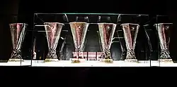 Sevilla's first six Europa League trophies on display in the club stadium