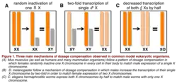 Three main mechanisms of dosage compensation observed in common model eukaryotic organisms.