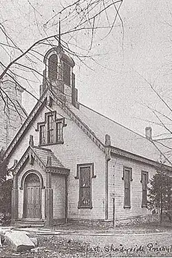 Built on land gifted by Thomas Aiken, the first Shadyside church was built to Aiken's designs. Work began in 1866 and was completed in 1867. By the early 1870s, the first building proved too small and plans were made for a second, larger building on the same site. Despite an economic depression in 1873, a second church was built to the plans of James H. Windrom of Philadelphia. Ground was broken in 1874 and the new building dedicated in 1875 with the first church building being retained for use as a chapel. With seating for 700 to 800, the second church was "English Decorated Gothic" in style and included a tower with spire which rose 140 feet into the sky.[4]