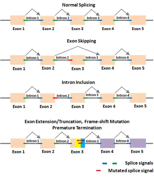 The different types of splicing mutations in genes. Mutations within the splicing regions of genes can lead to a defective transcript and protein. Depending on where exactly the mutation occurs and which "cryptic" splice site near the original site is chosen for splicing, the specific defect in the transcript and protein will vary. Frequently, splicing mutations will lead to exon skipping, intron inclusion, exon extension/truncation, and premature termination in the resulting transcript. The various defects in the transcript will in turn result in different kinds of disruption in the amino acid sequence of the protein.