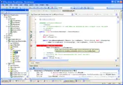 SharpDevelop was designed as a free and lightweight alternative to Microsoft Visual Studio, and contains an equivalent feature for almost every essential Visual Studio Express feature and features very similar to those found in Borland Kylix and Delphi, including advanced project management, code editing, application compiling and debugging functionality.[12][13] More specifically, the IDE includes a GUI designer, code/design views, syntax highlighting, auto completion menus (similar to IntelliSense[14]) the ability to compile and debug form/console .NET Framework applications,[6] a "New Project" wizard, toolbars, menus, panels and a docking system,[15]: 7 [16][17][18] and built-in code refactoring tools,[19][20] and it has an integrated debugger[21] that allows for stepping, viewing values of objects in memory, and breakpoints.[22]