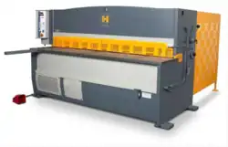 The machine used is called a squaring shear, power shear, or guillotine. The machine may be foot powered, less commonly hand powered, or mechanically or hydraulically powered. It works by first clamping the material with a ram. A moving blade then comes down across a fixed blade to shear the material. For larger shears the moving blade may be set on an angle or "rocked" in order to shear the material progressively from one side to the other; this angle is referred to as the shear angle. Setting the blade on an angle decreases the amount of force required, but increases the stroke. A 5-degree shear angle decreases the force by about 20% . The amount of energy used is still the same. The moving blade may also be inclined 0.5 to 2.5°, called the rake angle, to keep the material from becoming wedged between the blades. However, raking the blade compromises the squareness of the edge.[4] The machine consists of a shear table, work-holding device, upper and lower blades, and a gauging device. The shear table is the part of the machinery that the workpiece rests on whilst being shorn. The work-holding device is used to hold the workpiece in place and keep it from moving or buckling while under stress. The upper and lower blades are the piece of machinery that actually do the cutting, while the gauging device is used to ensure that the workpiece gets worked where it is supposed to be.