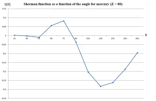 The Sherman function is a measure of the probability of a spin-up electron to be scattered, at a specific angle , to the right or to the left of the target, due to spin-orbit coupling.[8][9] It can assume values ranging from -1 (spin-up electron is scattered with 100% probability to the left of the target) to +1 (spin-up electron is scattered with 100% probability to the right of the target). The value of the Sherman function depends on the energy of the incoming electron, evaluated via the parameter .[1] When , spin-up electrons will be scattered with the same probability to the right and to the left of the target.[1]