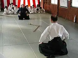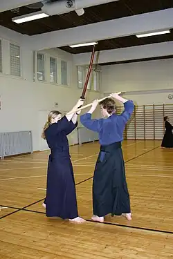 A normal training session is very systematic with the teacher, or a senior student, commanding the pace and direction of the session. Depending on the individual dōjō or organization, the entire group of trainees often starts training as one body, especially during warm-ups and drills. Often, the training then is split into beginner and advanced groups. Drills and forms involving newer students are often performed with a more senior student taking on the role of the attacker, or "striking sword" (打太刀, uchidachi). In paired techniques and drills, the receiver of the attack is called "doing sword" (仕太刀, shidachi).[8] The uchidachi usually is senior to the shidachi in terms of experience. This is done as a way to develop the younger shidachi's skill by having them face a more experienced and confident swordsman, which thus heightens the combative feeling.